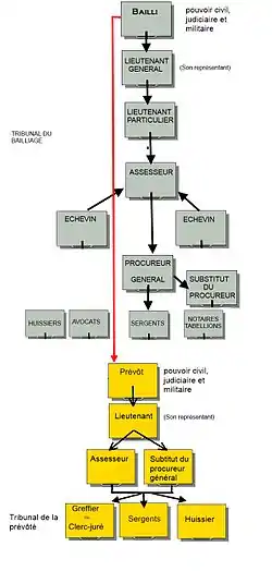 Au-dessous du prévôt se trouvait son lieutenant. Avec eux, il y avait un assesseur, un substitut du procureur général. Un huissier, un sergent, un greffier complétaient le tribunal de la prévôté. Ici, comme au chef-lieu du bailliage, les offices, à part ceux du prévôt et de son lieutenant, étaient plutôt des offices de judicature.