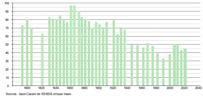 L'évolution du nombre d'habitants est connue à travers les recensements de la population effectués dans la commune depuis 1793. Pour les communes de moins de 10 000 habitants, une enquête de recensement portant sur toute la population est réalisée tous les cinq ans, les populations légales des années intermédiaires étant quant à elles estimées par interpolation ou extrapolation[15]. Pour la commune, le premier recensement exhaustif entrant dans le cadre du nouveau dispositif a été réalisé en 2005[16].