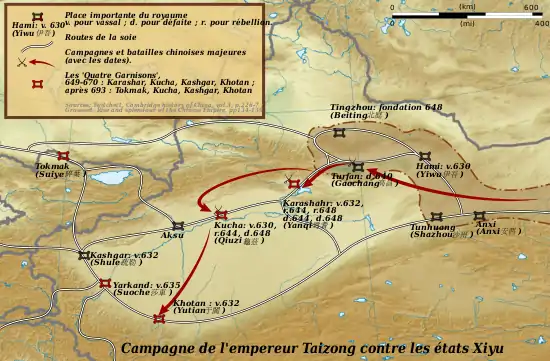 Ce premier succès aboutit donc au renforcement de l'armée des Tang. Les terres du Nord-Ouest étaient un atout crucial pour lui permettre d'utiliser les importants pâturages pour élever des chevaux dont elle avait désespérément besoin[52],[53]. Cela servit de base à de nouvelles conquêtes vers l'Ouest. Les Xueyantuo, qui avaient appuyé auparavant les Tang contre les Turcs, puis les Turcs occidentaux furent vaincus. Dans les années qui suivirent, les grandes cités de l'actuel Xinjiang passèrent sous domination chinoise : Hami, Turfan, Karashahr, Kucha. En 649, à la mort de Taizong, les Turcs se révoltèrent pour s'extraire du joug Tang, mais ils furent défaits à nouveau. Les troupes chinoises étendirent alors leur influence au-delà du Pamir, sur les cités du Turkestan occidental : Samarcande, Boukhara, Tachkent, etc. En 648, un général chinois intervient même dans une querelle successorale en Inde du Nord[54],[55].
