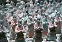 L'empire des Tang était néanmoins dominé par une « super-élite » constituée au début de la dynastie d'un nombre limité de familles qui se targuaient (à tort ou à raison) d'une grande ancienneté et d'aïeux prestigieux, mais dont la caractéristique essentielle était d'avoir rapidement décidé de servir la famille impériale, et rejoint la capitale, car l'exercice de fonctions à la cour était essentiel pour intégrer cette élite[139]. Ce groupe était dominé par des familles originaires de la région de Chang'an, qui avaient accompagné l'ascension des familles impériales des Sui et des Tang. Après elles venait un ensemble de lignages d'origine provinciale, d'extraction souvent plus récente. Le pouvoir impérial des Tang, dans le souci de mieux contrôler cette élite, procéda à leur enregistrement et attribua plus de prestige à ceux qui l'avaient bien servi, plutôt qu'à l'ancienneté du lignage : il y eut ainsi une volonté de lier complètement le prestige des grands lignages à l'exercice de fonctions pour le compte de l'empire. Par ailleurs, les empereurs pouvaient renforcer la dignité d'un lignage en offrant à un de ses membres un titre honorifique repris des temps antiques, et en le promouvant à un rang social plus élevé. Certains postes administratifs jugés plus honorables, liés à des rituels, étaient désignés comme « purs » et confiés de façon préférentielle suivant un principe héréditaire à des membres de cette aristocratie de fonction. Cela confortait sa position et la reproduction sociale car les membres des grandes familles avaient en général reçu une éducation lettrée très poussée dans les grandes écoles de la capitale (réservées aux membres des familles de plus haut rang) qui leur permettait de très bien figurer aux examens impériaux[140].