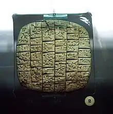 Quelques textes religieux ont également été exhumés, rédigés en sumérien et/ou en éblaïte. Des hymnes sont dédiés à des divinités importantes du panthéon[41]. L'hymne au dieu-soleil Shamash est le plus long texte littéraire rédigé en éblaïte. On a aussi retrouvé le fragment d'un mythe mettant en scène des divinités sumériennes (Enki, Enlil, Utu), inconnu ailleurs. Le dernier type de texte religieux connu sont des collections d'exorcismes servant à conjurer des maux : morsures de serpents et d'insectes, maladies (notamment des maux de dents)[42]. Plusieurs rituels ayant lieu dans des temples ainsi que des fêtes dédiées aux divinités principales du panthéon sont attestées[43]. Les Éblaïtes disposaient pour cela d'un calendrier religieux en parallèle à leur calendrier commun[44]. On peut ajouter à ce tableau les rituels liés à la royauté évoqués précédemment, qui avaient un aspect religieux du fait de l'imbrication entre religieux et politique et du caractère sacré du pouvoir politique.