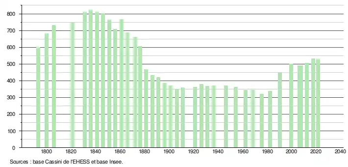 L'évolution du nombre d'habitants est connue à travers les recensements de la population effectués dans la commune depuis 1793. Pour les communes de moins de 10 000 habitants, une enquête de recensement portant sur toute la population est réalisée tous les cinq ans, les populations légales des années intermédiaires étant quant à elles estimées par interpolation ou extrapolation[16]. Pour la commune, le premier recensement exhaustif entrant dans le cadre du nouveau dispositif a été réalisé en 2007[17].