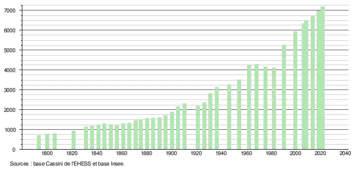 L'évolution du nombre d'habitants est connue à travers les recensements de la population effectués dans la commune depuis 1793. Pour les communes de moins de 10 000 habitants, une enquête de recensement portant sur toute la population est réalisée tous les cinq ans, les populations légales des années intermédiaires étant quant à elles estimées par interpolation ou extrapolation[33]. Pour la commune, le premier recensement exhaustif entrant dans le cadre du nouveau dispositif a été réalisé en 2008[34].