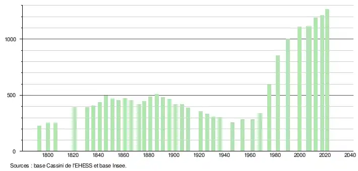 L'évolution du nombre d'habitants est connue à travers les recensements de la population effectués dans la commune depuis 1793. Pour les communes de moins de 10 000 habitants, une enquête de recensement portant sur toute la population est réalisée tous les cinq ans, les populations légales des années intermédiaires étant quant à elles estimées par interpolation ou extrapolation[22]. Pour la commune, le premier recensement exhaustif entrant dans le cadre du nouveau dispositif a été réalisé en 2007[23].