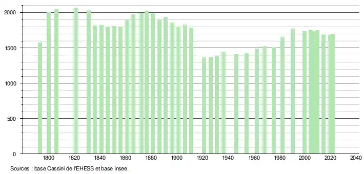 L'évolution du nombre d'habitants est connue à travers les recensements de la population effectués dans la commune depuis 1793. Pour les communes de moins de 10 000 habitants, une enquête de recensement portant sur toute la population est réalisée tous les cinq ans, les populations légales des années intermédiaires étant quant à elles estimées par interpolation ou extrapolation[37]. Pour la commune, le premier recensement exhaustif entrant dans le cadre du nouveau dispositif a été réalisé en 2004[38].