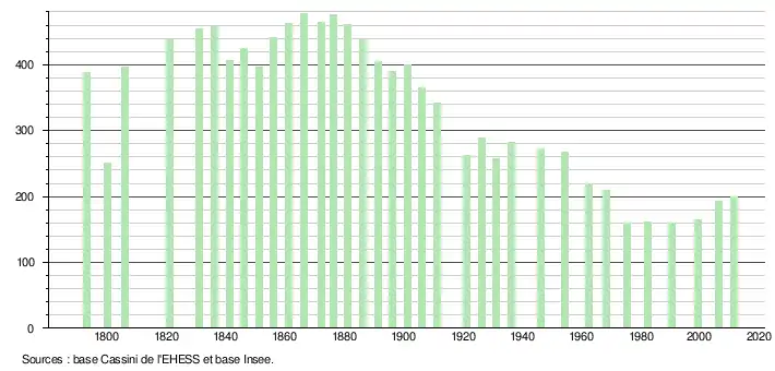 L'évolution du nombre d'habitants est connue à travers les recensements de la population effectués dans la commune depuis 1793. À partir du , les populations légales des communes sont publiées annuellement dans le cadre d'un recensement qui repose désormais sur une collecte d'information annuelle, concernant successivement tous les territoires communaux au cours d'une période de cinq ans. Pour les communes de moins de 10 000 habitants, une enquête de recensement portant sur toute la population est réalisée tous les cinq ans, les populations légales des années intermédiaires étant quant à elles estimées par interpolation ou extrapolation[7]. Pour la commune, le premier recensement exhaustif entrant dans le cadre du nouveau dispositif a été réalisé en 2006[8],[Note 2].