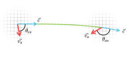 - est l'angle entre la vitesse de l'observateur et la vitesse de la lumière au moment de la réception