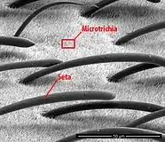 La fougère flottante Salvinia avec ses poils[3] aux formes extrêmement compliquées et l’insecte aquatique Notonecta qui nage sur le dos avec une structure complexe et double de poils (Setae) et de Microtrichia se sont avérés être des exemples biologiques parfaits. Trois des environ dix sortes les plus connues de Salvinia montrent en outre l’étonnante et paradoxale particularité d’une hétérogénéité chimique: des pointes de poils hydrophiles qui stabilisent en plus la couche d’air.