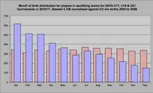 Les termes biais du mois de naissance et biais de la saison de naissance sont utilisés pour décrire un effet similaire mais sont fondamentalement différents. La saison de naissance examine l'influence de différents facteurs environnementaux saisonniers prénatals et périnatals, tels que la lumière du soleil, la température ou l'exposition virale pendant la gestation, qui sont liés aux résultats de santé[9]. A l'inverse, l'effet de l'âge relatif se déplace avec les dates de sélection, déplaçant l'avantage avec la période de sélection[10],[11]. Sous l'influence des agents sociaux, un enfant né peu après la date limite de début de sélection est généralement inclus, tandis qu'un enfant né peu avant la date limite est exclu[12].