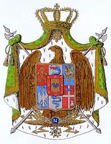| .jpg.webp) | Royaume napoléonien d'Italie Ecartelées de l'Église, de Venise au champ d'azur et le lion portant un bonnet phrygien, de Modène et de Piemont, un pal de Milan-Visconti entre les écartelures, sur le tout d'or à la couronne antique de sable, une bordure de gueules chargée de huit anneaux d'argent. L'écu, ceint du grand collier de l'ordre de la légion d'honneur, est placé sur une aigle napoléonienne, sommée d'une étoile d'or frappée, d'un N et deux haches en sautoir, sous un manteau de sinople sommé d'une couronne royale d'or | 1805-1814 |