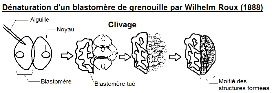 Dans son expérience pionnière en embryologie expérimentale, Wilhelm Roux dénature un des deux blastomères de grenouille Rana fusca à l’aide d’une aiguille chaude. Le blastomère de gauche est ainsi tué par l’aiguille mais celui de droit demeure intact et poursuit sa segmentation. Le résultat est qu’il y a formation de la moitié des structures larvaires par le blastomère intact. Roux conclut que le développement des cellules embryonnaires est prédéterminé. Ce genre de développement observé chez les grenouilles est nommé « développement mosaïque » et se retrouve chez plusieurs autres taxons tels que le nématode Caenorhabditis elegans qui a fait objet de nombreuses études[4].