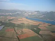 Pylônes ondes longues de RMC et ligne de feeder acheminant la modulation.