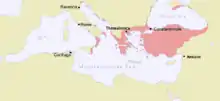 Au VIe siècle, sous le règne de Justinien Ier (527-565), ses deux généraux Bélisaire et Narsès reconquièrent une grande partie des provinces occidentales : l'Italie, l'Afrique du Nord, et l'Hispanie du Sud[28]. Ils restaurent ainsi brièvement l'« Imperium Romanum » dans ses limites méditerranéennes, mais sans reprendre pied en Gaule. Cependant, les guerres contre les royaumes des Vandales et des Goths à l'ouest, et contre le puissant Empire sassanide de Khosro Ier à l'est, auxquelles vient s'ajouter une épidémie de peste (dite « peste de Justinien ») qui ravage à partir de 541 tout le bassin méditerranéen, affectent sérieusement l'équilibre de l'Empire[29]. Des recherches récentes lient cette épidémie à un refroidissement du climat mondial causé par plusieurs explosions volcaniques très importantes[30].