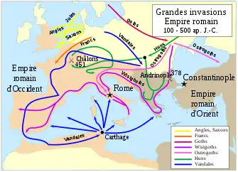 À la fin du IVe siècle, au début des « grandes invasions », la partie orientale de l'Empire devient une cible pour les peuples germaniques, notamment les Wisigoths et les Ostrogoths. En 378, à la bataille d'Andrinople, les Goths infligent une cuisante défaite à l'armée romaine d'Orient. Théodose Ier leur concède, en 382, un territoire au sud du Danube en signant un nouveau fœdus avec eux[20].
