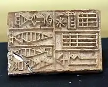 Tablette administrative enregistrant des livraisons d'équipement militaire (arcs, flèches, carquois, lances, casques) à des intendants. Suse, Musée du Louvre.