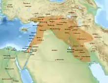 Extension de l'empire assyrien sous les Sargonides. Les territoires en orange correspondent aux provinces à l'époque d'Assarhaddon. Les territoires inclus dans les espaces en pointillés sont ceux qui ont eu un statut de vassal de l'Assyrie sous les Sargonides.