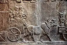 Sargon II, sur un char écrasant un ennemi, regardant l'assaut d'une cité ennemie. Bas-relief du palais de Dur-Sharrukin, musée national d'Irak.