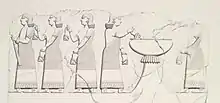 Bas-relief du Palais nord-ouest de Nimroud représentant Assurnasirpal II et des dignitaires, surplombés par le disque solaire ailé symbolisant le dieu Assur ou Shamash. British Museum.