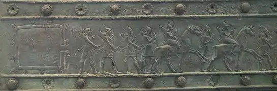 Assurbanipal sur son char, derrière ses troupes, passant en revue le butin et les prisonniers après la défaite de son frère et la prise de Babylone en 648. Bas-relief du Palais nord de Ninive, British Museum. L'inscription dit : « Moi, Assurbanipal, roi de l'univers, roi du pays d'Assur, qui, sur l'ordre des grands dieux, a réalisé les désirs de son cœur : les vêtements et les ornements - l'insigne royal de Shamash-shum-ukin, l'infidèle frère - son harem, ses officiers, ses troupes de combat, son char (de combat), son char de procession - son véhicule d'État -, toutes les provisions qui se trouvaient dans son palais, les gens, hommes et femmes, grands et petits – ils ont fait passer devant moi[77]. »