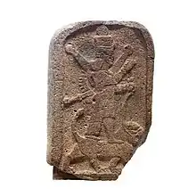 Stèle de Bel-Harran-beli-usur, représenté dans la pose des rois assyriens, mais sans barbe (indication de sa condition d'eunuque) ni couvre-chef, devant des symboles divins, commémorant la fondation de la ville à son nom, Dur-Bel-Harran-beli-usur, mise au jour à Tell Abda[53]. Musée archéologique d'Istanbul.