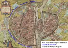 L'enceinte de Charles V, construite de 1356 à 1383, est une des sept grandes enceintes ayant chronologiquement entouré Paris[1]. Elle remplace sur la rive droite celle de Philippe Auguste[2]. Sa partie occidentale, devenue inutile après la construction de l'enceinte de Louis XIII, est démolie vers 1640[3]. Sa partie orientale, renforcée par la création de bastions au milieu du XVIe siècle, est détruite à partir de 1670, laissant la place aux Grands Boulevards. Ce rempart dont il demeure peu de vestiges a laissé une forte empreinte sur le plan de la ville.