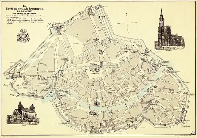 Après la bataille d'Oberhausbergen du , opposant les Strasbourgeois à l'évêque Walter de Géroldseck, le Conseil de la ville est débarrassé de la tutelle épiscopale. Strasbourg restera une ville libre du Saint-Empire romain germanique jusqu'à sa capitulation du face aux armées françaises de Louis XIV[35]