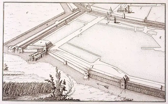 Vue sur les fortifications strasbourgeoises à la sortie de l'İll.