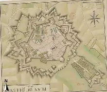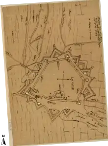- Seul le plan de 1654 représente le flanc gauche avec un orillon, le plan Deventer et celui d'Olgiati & van Noyen représentent des flancs droits.