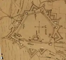 - en 1712, deux demi-lunes non revêtues sont construites en avant de la courtine 7-8 entre la demi-lune 17 et la demi-lune du gard (18)[note 14] ;