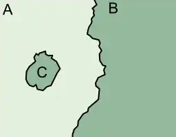 De même, une enclave dans un territoire externe ne partage normalement aucune frontière commune avec la frontière externe de ce territoire externe ; mais il arrive qu'il y ait un ou plusieurs points communs sur ces deux frontières quand il a été impossible de déterminer à quel territoire appartiennent ces points (et une petite zone tout autour de chaque point commun) où l'enclave touche la frontière externe du territoire externe.[pas clair]