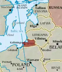 - Le territoire russe de l'oblast de Kaliningrad, entre la Pologne et la Lituanie, qui, avant la Seconde Guerre mondiale était la cité allemande de Königsberg, capitale de la Prusse-Orientale, elle-même une exclave allemande.