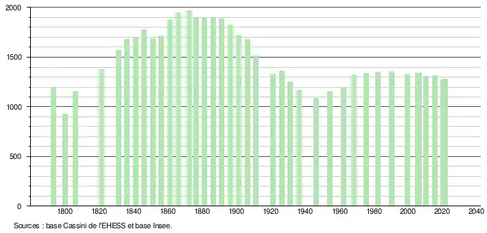 L'évolution du nombre d'habitants est connue à travers les recensements de la population effectués dans la commune depuis 1793. Pour les communes de moins de 10 000 habitants, une enquête de recensement portant sur toute la population est réalisée tous les cinq ans, les populations légales des années intermédiaires étant quant à elles estimées par interpolation ou extrapolation[22]. Pour la commune, le premier recensement exhaustif entrant dans le cadre du nouveau dispositif a été réalisé en 2005[23].
