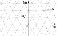 est une racine cubique primitive de l'unité (souvent autrement notée j). Les entiers d'Eisenstein forment un réseau triangulaire dans le plan complexe. Ils contrastent avec les entiers de Gauss qui forment un réseau carré dans le plan complexe. Ils constituent un exemple d'anneau des entiers d'un corps quadratique qui, comme tout anneau des entiers d'une extension finie du corps des rationnels, est un anneau de Dedekind.