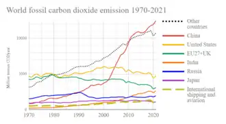 En 2006, avec plus de 5 700 millions de tonnes par an, les États-Unis sont le deuxième pays émetteur de dioxyde de carbone du monde derrière la Chine[22]. Rapporté au nombre d'habitants, les émissions américaines sont de 19,1 tonnes/hab., soit le huitième taux le plus fort du monde[22].