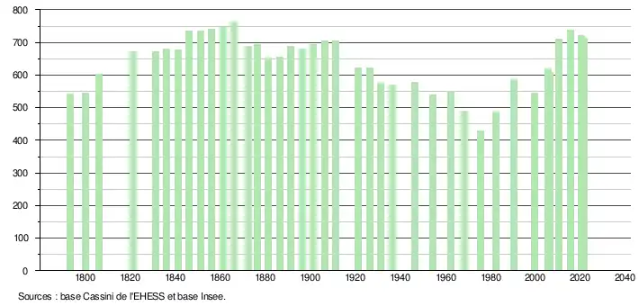 L'évolution du nombre d'habitants est connue à travers les recensements de la population effectués dans la commune depuis 1793. Pour les communes de moins de 10 000 habitants, une enquête de recensement portant sur toute la population est réalisée tous les cinq ans, les populations légales des années intermédiaires étant quant à elles estimées par interpolation ou extrapolation[18]. Pour la commune, le premier recensement exhaustif entrant dans le cadre du nouveau dispositif a été réalisé en 2005[19].