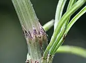 Dans les deux cas, les feuilles sont réduites à de simples collerettes situées au niveau des nœuds des tiges et rameaux, sous forme d'une courte gaine dentée.