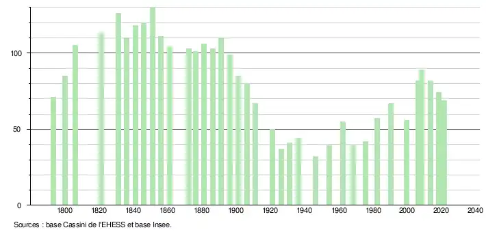 L'évolution du nombre d'habitants est connue à travers les recensements de la population effectués dans la commune depuis 1793. Pour les communes de moins de 10 000 habitants, une enquête de recensement portant sur toute la population est réalisée tous les cinq ans, les populations légales des années intermédiaires étant quant à elles estimées par interpolation ou extrapolation[24]. Pour la commune, le premier recensement exhaustif entrant dans le cadre du nouveau dispositif a été réalisé en 2008[25].