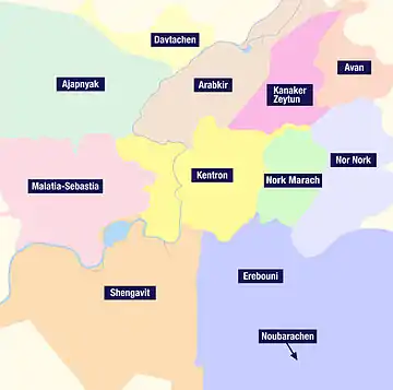 Erevan, contrairement aux autres villes d'Arménie, ne fait pas partie d'un marz (région), étant elle-même une communauté spécifique[31],[32], entourée au nord par le marz de Kotayk, au sud par celui d'Ararat, au sud-ouest par celui d'Armavir et au nord-ouest par celui d'Aragatsotn.