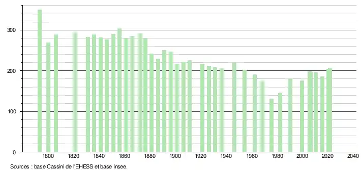 L'évolution du nombre d'habitants est connue à travers les recensements de la population effectués dans la commune depuis 1793. Pour les communes de moins de 10 000 habitants, une enquête de recensement portant sur toute la population est réalisée tous les cinq ans, les populations légales des années intermédiaires étant quant à elles estimées par interpolation ou extrapolation[21]. Pour la commune, le premier recensement exhaustif entrant dans le cadre du nouveau dispositif a été réalisé en 2005[22].