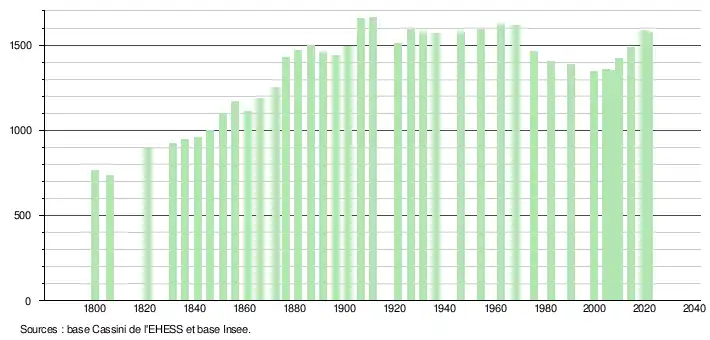 L'évolution du nombre d'habitants est connue à travers les recensements de la population effectués dans la commune depuis 1800. Pour les communes de moins de 10 000 habitants, une enquête de recensement portant sur toute la population est réalisée tous les cinq ans, les populations légales des années intermédiaires étant quant à elles estimées par interpolation ou extrapolation[27]. Pour la commune, le premier recensement exhaustif entrant dans le cadre du nouveau dispositif a été réalisé en 2004[28].