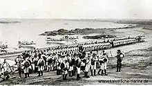 Quant aux unités navales des Allemands, elles sont quasiment inutilisables. Les canonnières[22], qui avaient été désarmées pour armer le Prinz Eitel Friedrich en août, sont coulées par ordre du gouverneur pendant la nuit du 27 au 28 septembre et les deux navires restants, la SMS Jaguar et le croiseur de la marine austro-hongroise SMS Kaiserin Elisabeth ne font pas le poids, malgré l'exploit du S 90. Le Kaiserin Elisabeth se saborde le 2 novembre.