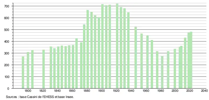 L'évolution du nombre d'habitants est connue à travers les recensements de la population effectués dans la commune depuis 1793. Pour les communes de moins de 10 000 habitants, une enquête de recensement portant sur toute la population est réalisée tous les cinq ans, les populations légales des années intermédiaires étant quant à elles estimées par interpolation ou extrapolation[23]. Pour la commune, le premier recensement exhaustif entrant dans le cadre du nouveau dispositif a été réalisé en 2008[24].