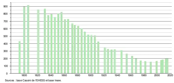 L'évolution du nombre d'habitants est connue à travers les recensements de la population effectués dans la commune depuis 1793. Pour les communes de moins de 10 000 habitants, une enquête de recensement portant sur toute la population est réalisée tous les cinq ans, les populations légales des années intermédiaires étant quant à elles estimées par interpolation ou extrapolation[5]. Pour la commune, le premier recensement exhaustif entrant dans le cadre du nouveau dispositif a été réalisé en 2008[6].