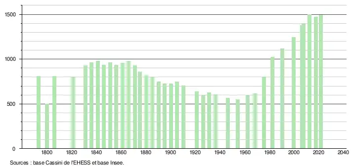 L'évolution du nombre d'habitants est connue à travers les recensements de la population effectués dans la commune depuis 1793. Pour les communes de moins de 10 000 habitants, une enquête de recensement portant sur toute la population est réalisée tous les cinq ans, les populations légales des années intermédiaires étant quant à elles estimées par interpolation ou extrapolation[9]. Pour la commune, le premier recensement exhaustif entrant dans le cadre du nouveau dispositif a été réalisé en 2007[10].