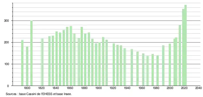 L'évolution du nombre d'habitants est connue à travers les recensements de la population effectués dans la commune depuis 1793. Pour les communes de moins de 10 000 habitants, une enquête de recensement portant sur toute la population est réalisée tous les cinq ans, les populations légales des années intermédiaires étant quant à elles estimées par interpolation ou extrapolation[38]. Pour la commune, le premier recensement exhaustif entrant dans le cadre du nouveau dispositif a été réalisé en 2008[39].
