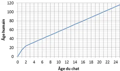 L'espérance de vie de cet animal se situe généralement entre 12 et 15 ans, mais certains chats atteignent 21 ans, soit l'équivalent du centenaire chez les humains[1]. Un chat d'un an a un développement comparable à celui d'un être humain de 15 ans[2]. Un chat de deux ans a un développement similaire à un être humain de 24 ans[3]. Par la suite, la croissance de l'équivalence s'affaiblit (l'âge humain par rapport à celui du chat croit de moins en moins vite), comme l'illustre le diagramme ci-dessous. Un chat de 7 ans a ainsi un développement similaire à un être humain de 44 ans, et un chat de 15 ans a alors un développement équivalent à celui d'un humain de 76 ans[2].