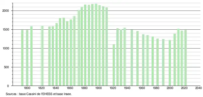 L'évolution du nombre d'habitants est connue à travers les recensements de la population effectués dans la commune depuis 1793. Pour les communes de moins de 10 000 habitants, une enquête de recensement portant sur toute la population est réalisée tous les cinq ans, les populations légales des années intermédiaires étant quant à elles estimées par interpolation ou extrapolation[30]. Pour la commune, le premier recensement exhaustif entrant dans le cadre du nouveau dispositif a été réalisé en 2006[31].
