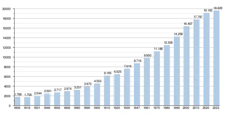 - Source : DGS - Remarque : 1806 jusqu'à 1981 = recensement ; depuis 1990 = nombre d'habitants chaque 1er janvier[4]