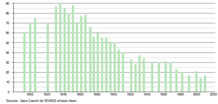 - Par convention dans Wikipédia, le principe a été retenu de n’afficher dans le tableau des recensements et le graphique, pour les populations légales postérieures à 1999, que les populations correspondant à une enquête exhaustive de recensement pour les communes de moins de 10 000 habitants, et que les populations des années 2006, 2011, 2016, etc. pour les communes de plus de 10 000 habitants, ainsi que la dernière population légale publiée par l’Insee pour l'ensemble des communes.