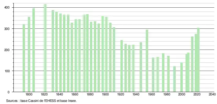 L'évolution du nombre d'habitants est connue à travers les recensements de la population effectués dans la commune depuis 1793. Pour les communes de moins de 10 000 habitants, une enquête de recensement portant sur toute la population est réalisée tous les cinq ans, les populations légales des années intermédiaires étant quant à elles estimées par interpolation ou extrapolation[14]. Pour la commune, le premier recensement exhaustif entrant dans le cadre du nouveau dispositif a été réalisé en 2008[15].
